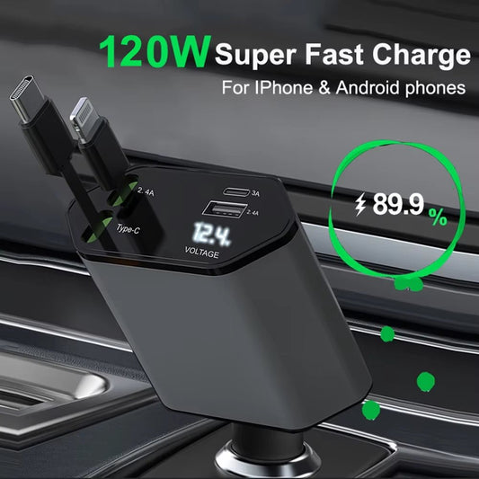 PowerDrive 120W Schnellladegerät mit 2 ausziehbaren Kabeln, Typ C für iPhone und Huawei