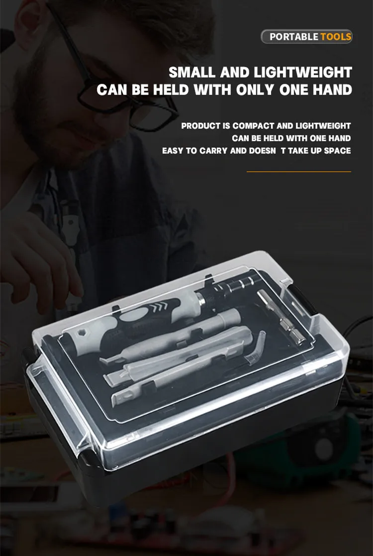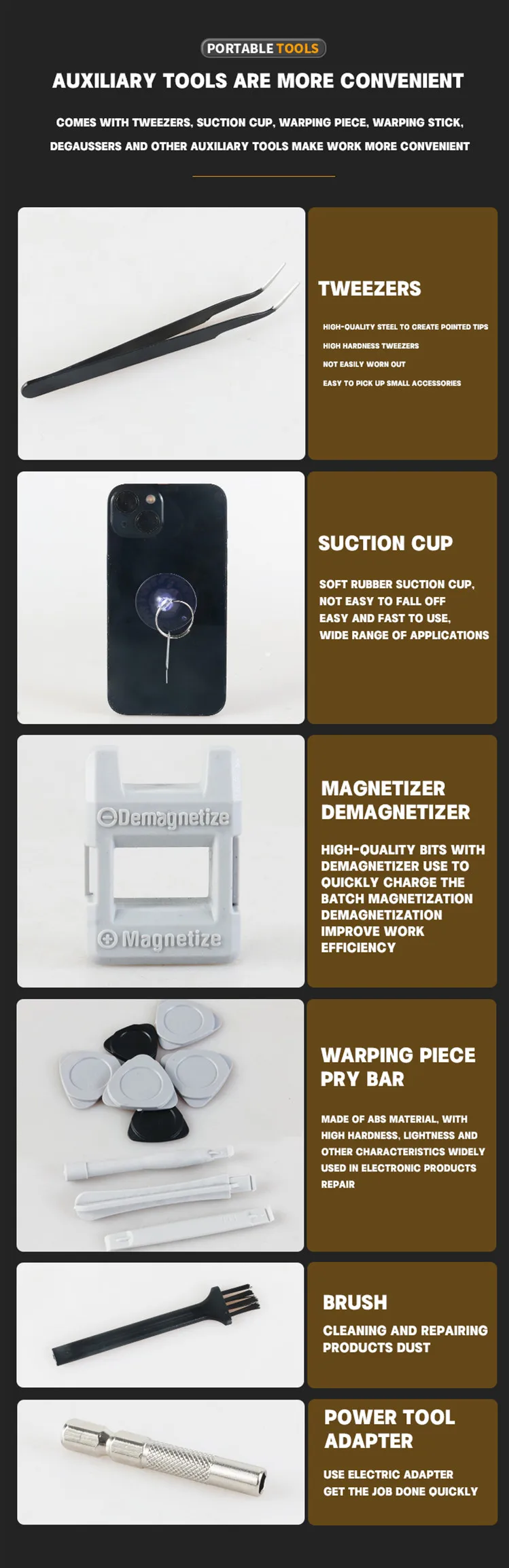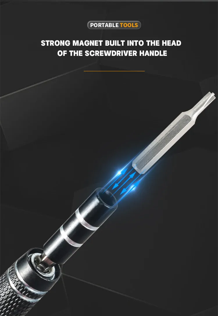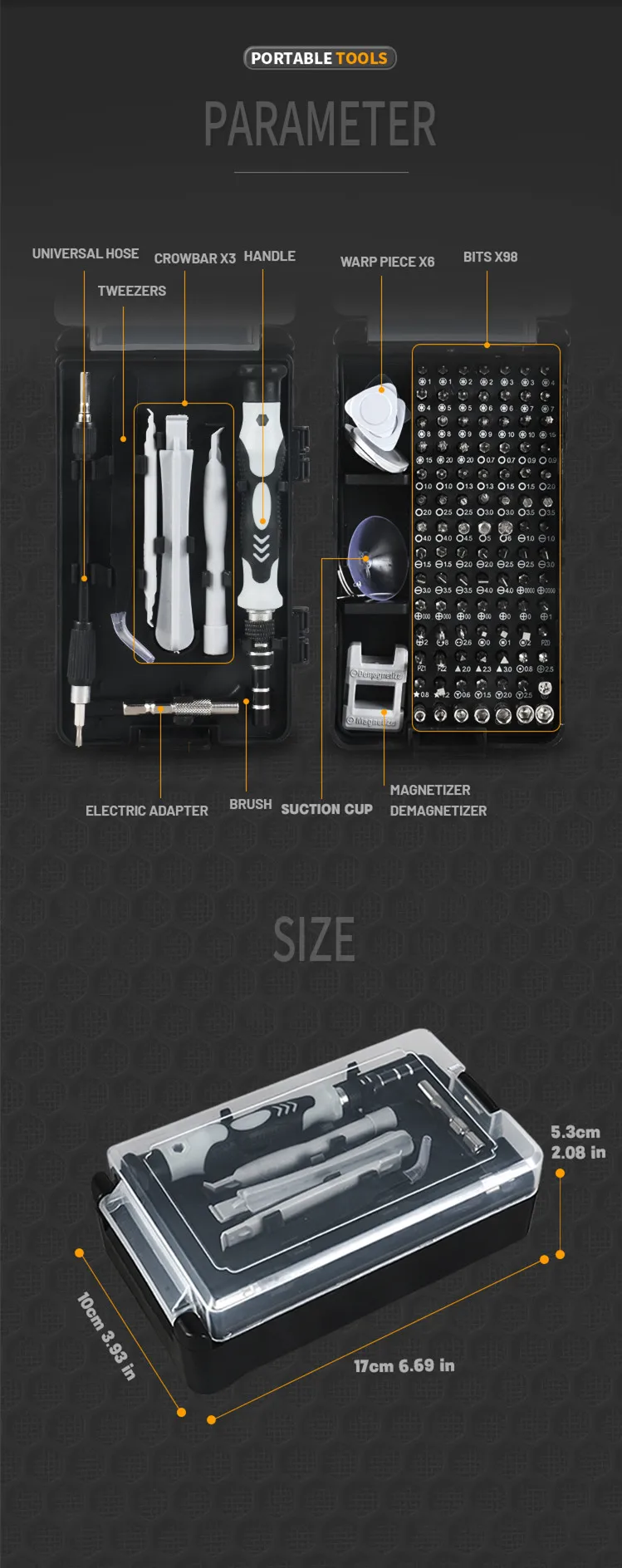 Entdecken Sie das ultimative Schraubendreher-Set, das mit 100 verschiedenen Aufsätzen (Phillips, Schlitz, Torx, Torx-Sicherheit, Pentalobe, Sechskant usw.) und diversen Öffnungswerkzeugen ausgestattet ist. Dieses Set ist ein unverzichtbares Werkzeug für jede Haushaltsreparatur.