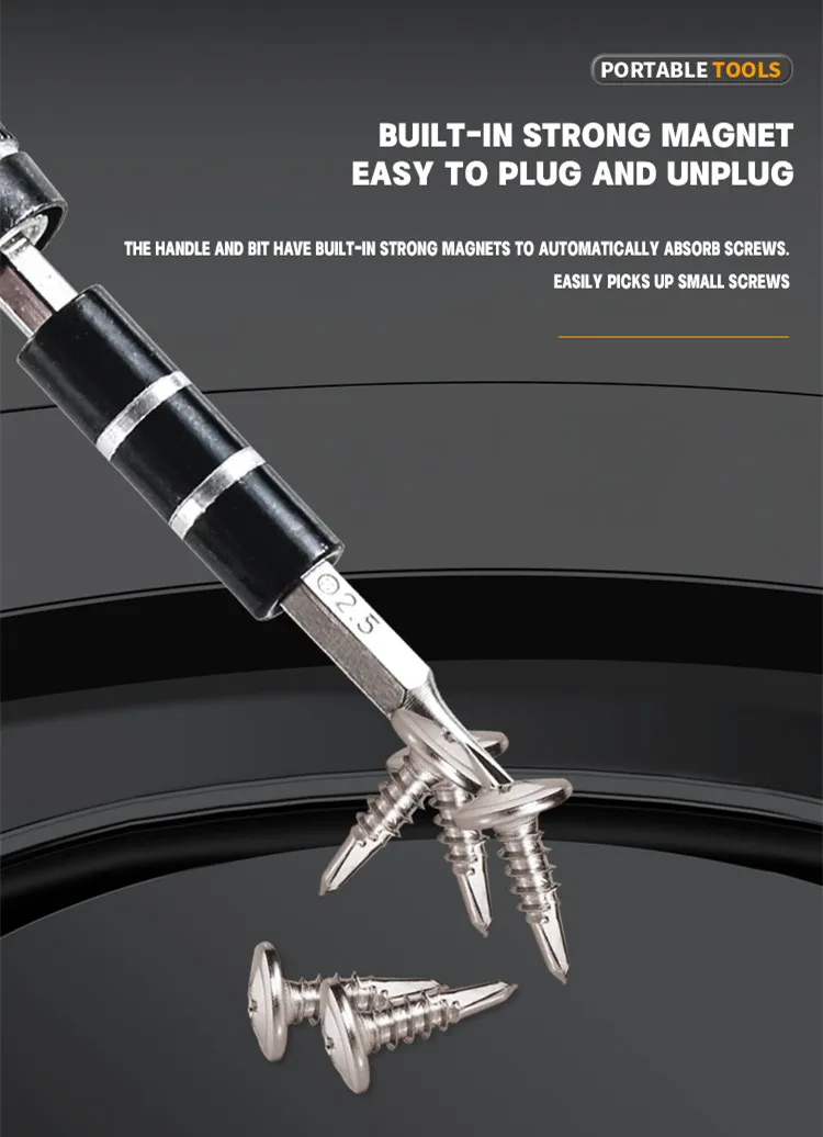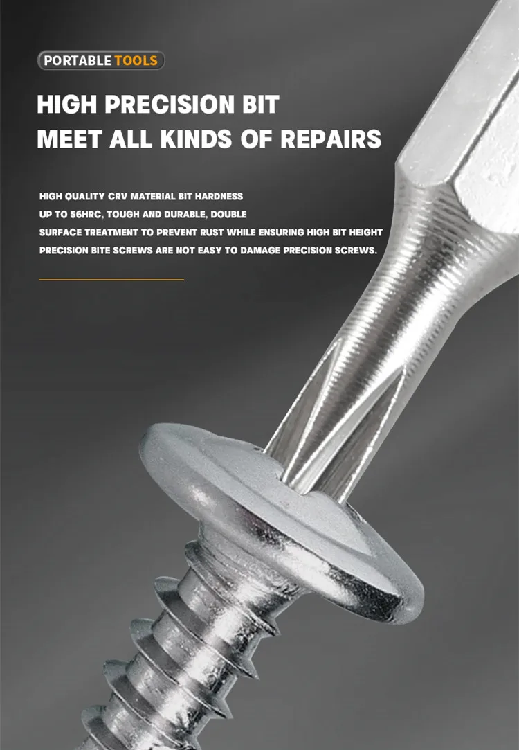 Die Bits bestehen aus hochwertigem Chrom-Vanadium-Stahl, der für seine Langlebigkeit bekannt ist. Mit einer Härte von über HRC65° sind diese Bits besonders abriebfest, oxidationsbeständig und korrosionsgeschützt, sodass sie über lange Zeit hinweg zuverlässig sind. Der starke, magnetisierbare Kopf erleichtert das Aufnehmen und Halten von kleinen Schrauben.