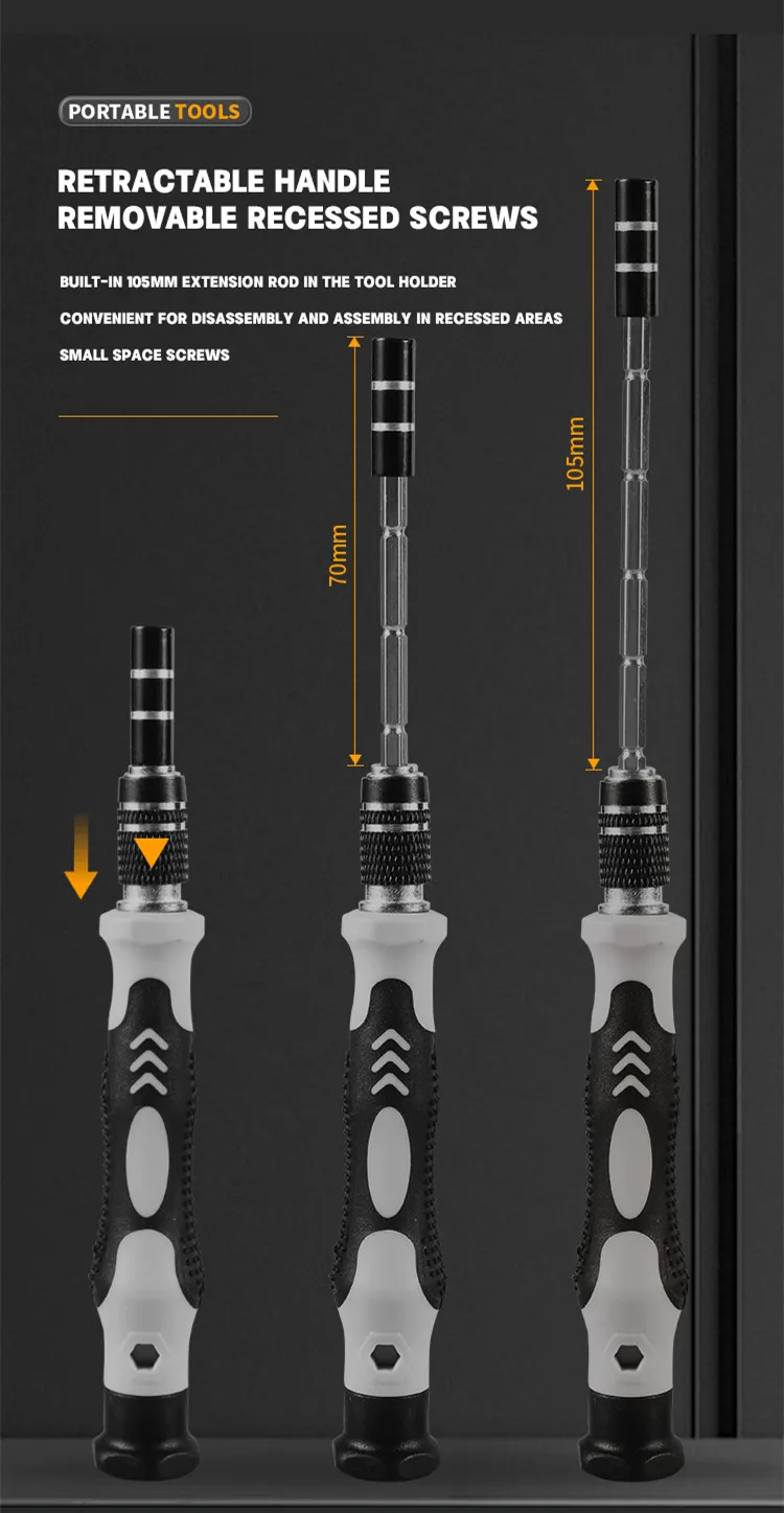 Dank des ergonomischen Designs mit einem glatten Drehkopf ist das Entfernen von Schrauben mühelos. Der Griff aus Gummi und PP+TPR sorgt für einen festen Halt und ermöglicht müheloses Drehen, auch an schwer zugänglichen Stellen, dank des flexiblen Verlängerungswerkzeugs.