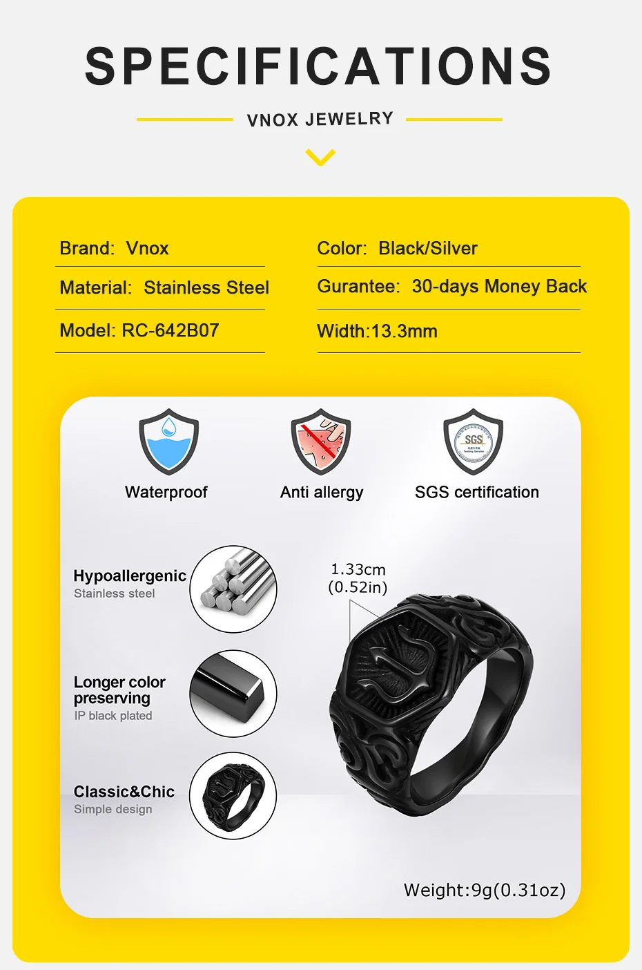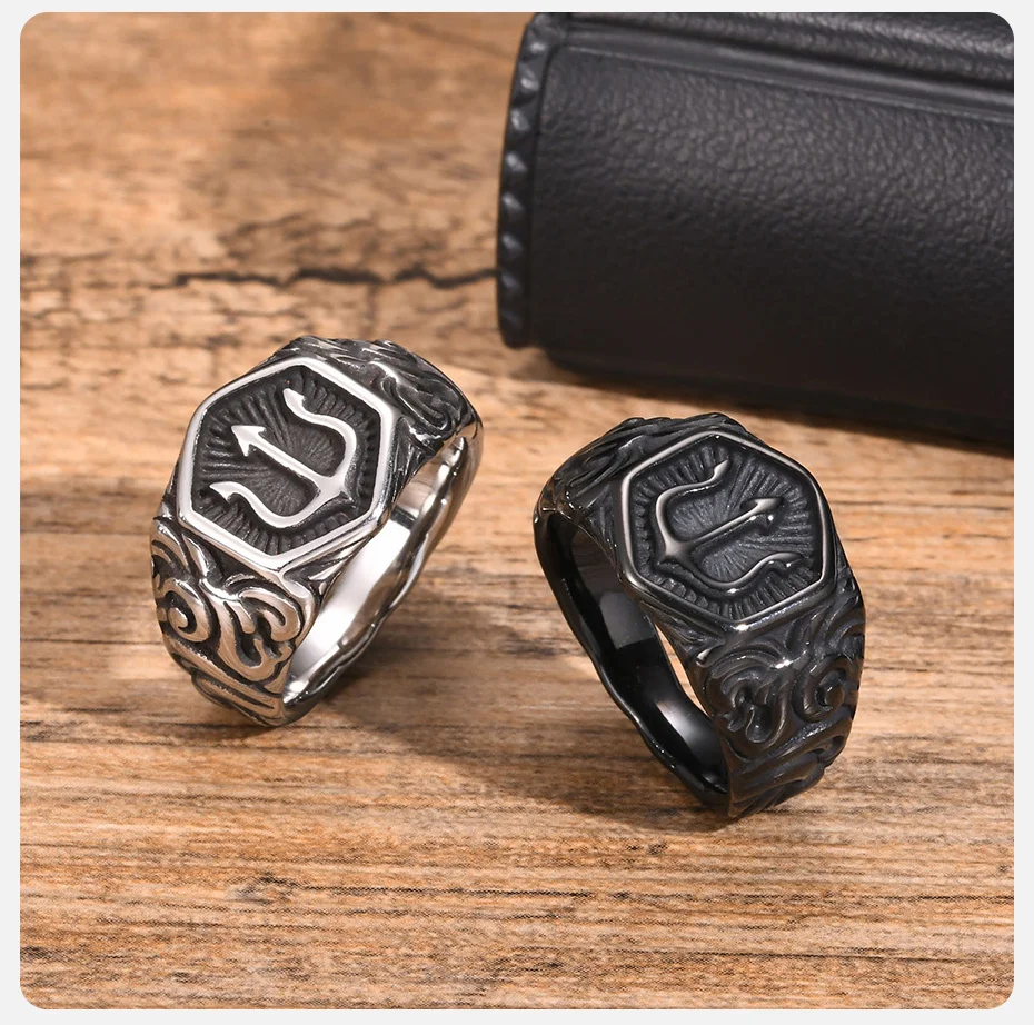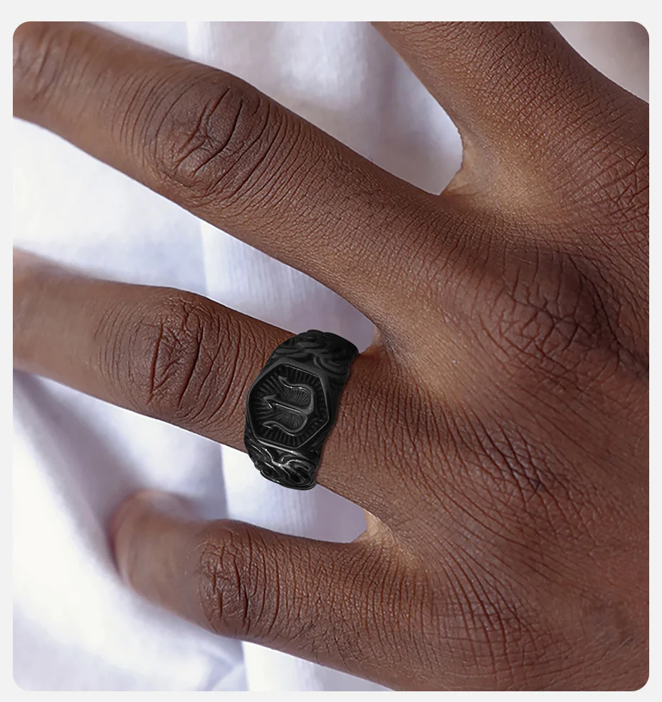Schwarzer Dreizack-Ringsiegel für Männer, 13.3mm breites Hexagon-Geometrie-Top-Fingerband, Kraftsymbol-Schmuck